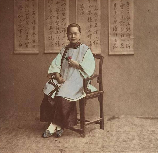 【图5】一名年轻女子坐在椅子上。从这张照片中,我们可以看出摄影师在审美方面还是很有研究的。不但在背景墙上挂了四幅书法卷轴,关键是椅子还不正着放,故意摆歪了,让人斜坐在上面,却把脸扭过来正对着镜头。这样拍出来的效果是不是就不死板了? 【图6】手持扇子,穿着粉色衣服的年轻女子。她头上戴的这个不能叫帽子吧?应该叫什么呢? 【图7】一名年轻男子斜望着前方,他身上穿的衣服,像不像官府里当差的穿的服装?