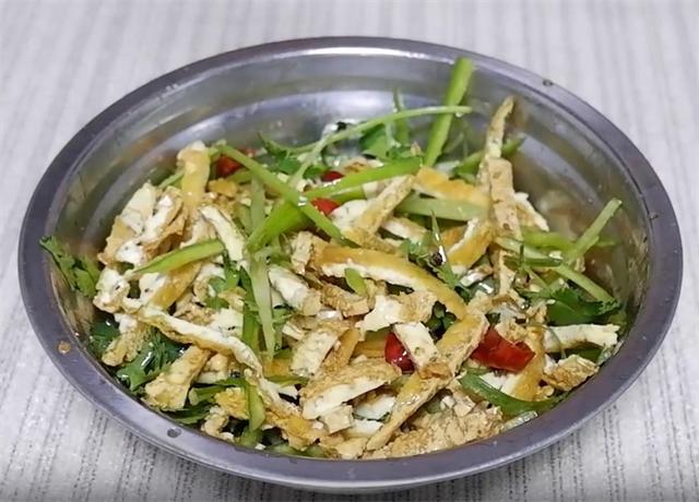 6.然后加入青椒丝、葱丝、蒜末,加入盐、少量的酱油、素蚝油、白醋、香油和白糖,最后加入炸香的辣椒和香菜。