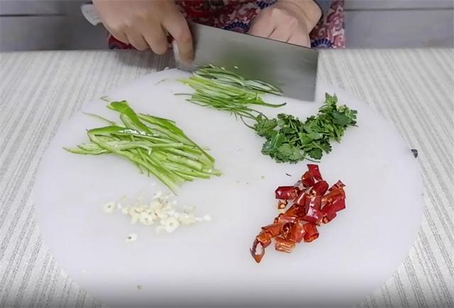 2.再切一些干辣椒、蒜末、青椒丝、香菜和葱丝。