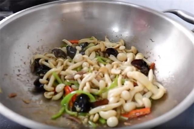 5.再另起锅加稍多一点的油,下入葱姜调味,然后下入木耳和白玉菇炒匀,再加入辣椒炒出辣味,接着加入酱油、素蚝油、盐,炒匀调味,最后淋入少量的水淀粉炒匀就可以出锅了。