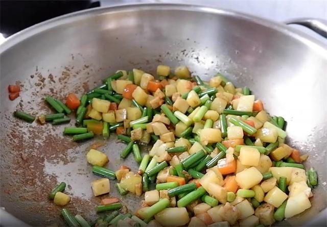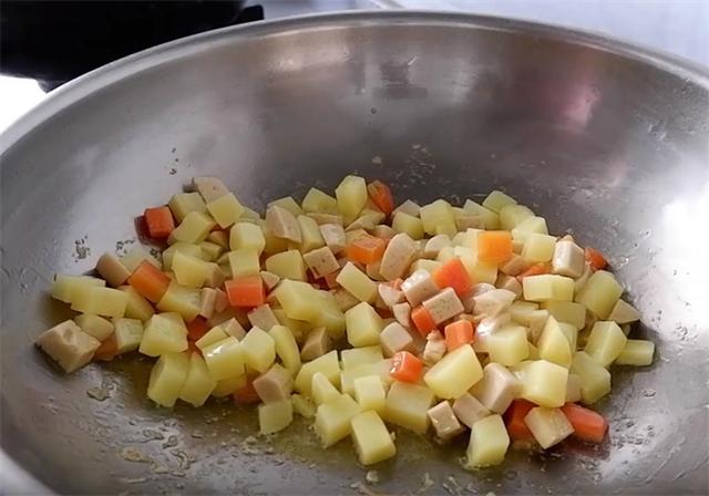 5.再另起锅,加入适量的油,下入素火腿肠、土豆块和胡萝卜炒匀。