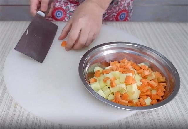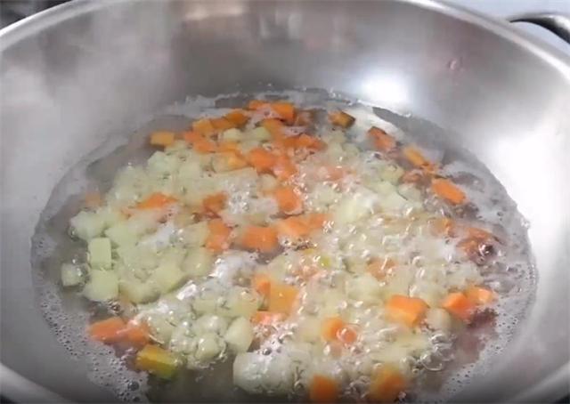 4.把土豆和胡萝卜焯水,开水下锅煮十分钟,土豆块八分熟就可以捞出了。