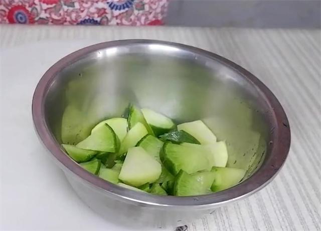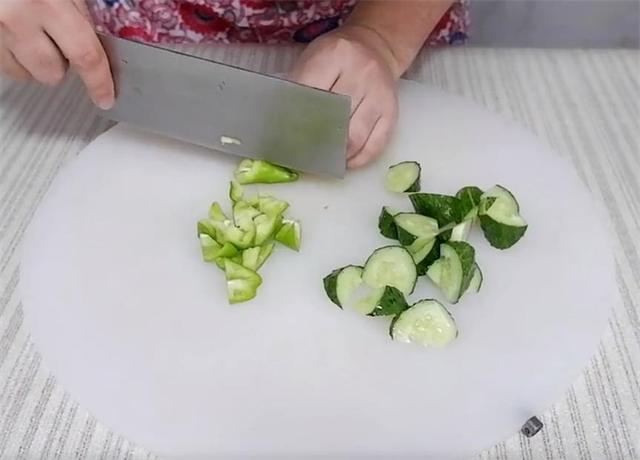 2.接着再取半根黄瓜和辣椒,也切滚刀块,辣椒和黄瓜可以切的小块一点。