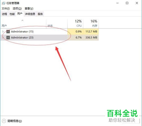 7. 最后打开【任务管理器】窗口,根据下图箭头所指,即可同时显示多个用户。