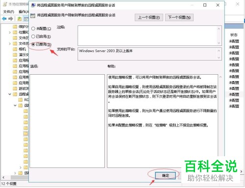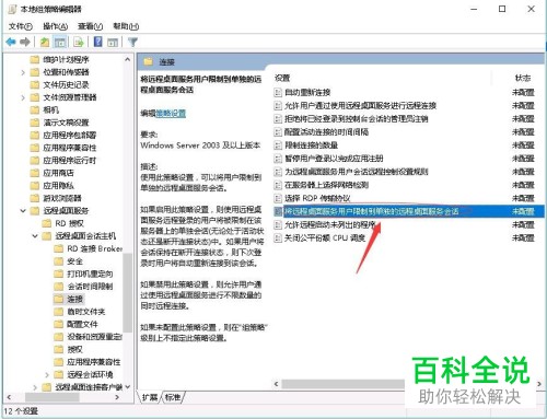5. 第五步在右侧页面中,根据下图箭头所指,鼠标左键双击【将远程桌面服务的用户限制到单独的远程桌面会话】选项。