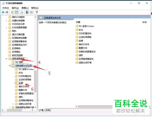 4. 第四步根据下图箭头所指,依次点击【计算机配置-管理模板-Windows 组件-远程桌面服务-远程桌面会话主机-连接】选项。