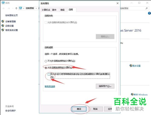 2. 第二步在弹出的窗口中,根据下图箭头所指,先勾选【允许远程连接到此计算机】,接着取消勾选【仅允许运行使用网络级别身份验证的远程桌面的计算机连接】,然后点击【确定】选项。