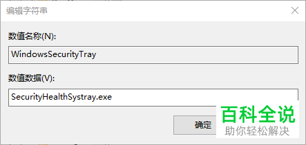 6. 最后双击字符串,在弹出的【编辑字符串】窗口中,根据下图所示,将【数值数据】设置为【SecurityHealthSystray.exe】并点击【确定】选项。重启电脑后,即可在任务栏显示【Windows Defender】图标。