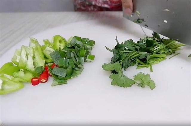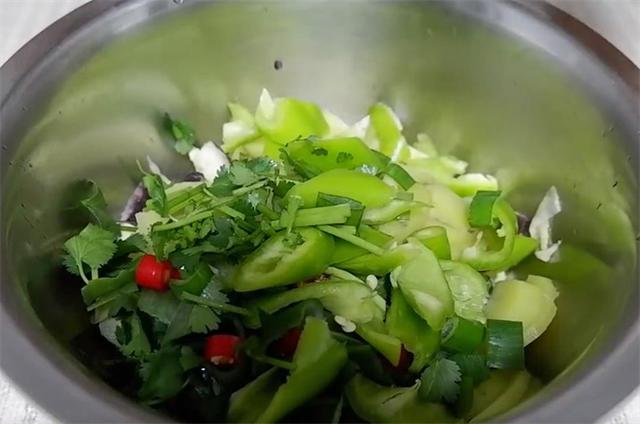 2.切一根青椒,两个小米辣,再切葱叶和香菜。