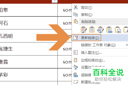 5. 第五步,我们还可以使用同步数据的功能,右击Excel软件中的表格,接着点击弹出窗口中的更新链接选项,就可以成功同步Excel数据到Word文档了。