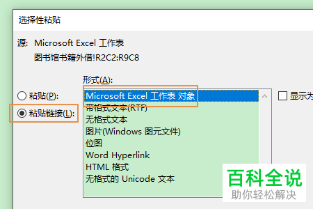3. 第三步,在下图所示的选择性粘贴窗口中,勾选粘贴链接左边的选项框,接着的点击选择橙框中的Microsoft Excel2003 工作表 对象选项。