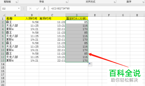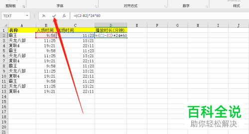 2. 第二步,接下来,请大家在如图方框所示的单元格中输入“=(最后时间-开始时间)*24*60”,表中为(=(C2-B2)*24*60),效果如图。