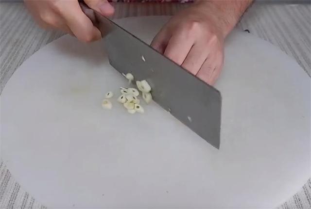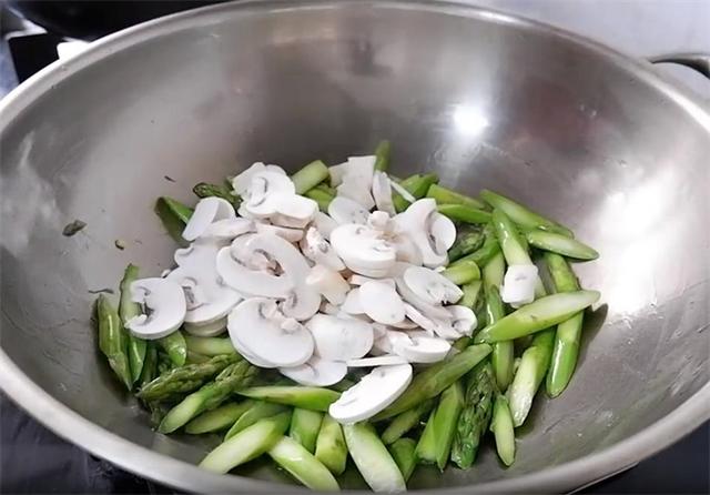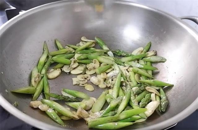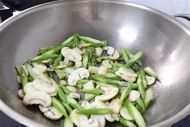 4.接着起锅加稍多一点的油,下入蒜炒香,然后再下入芦笋,中火炒个一分钟左右,芦笋会变得翠绿,就可以下入口菇了。