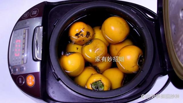 二:高温催熟法。 在以前,农村土灶比较多,土灶附近往往会放一个温水缸,老一辈就会将柿子泡在温水缸里,大概1~2天的样子,柿子就变甜可以吃了。这个方法主要就是利用温水的温度和氧气的作用,促进柿子的成熟和去涩。现在我们住的楼房没有土灶,那么我们也可以利用同一原理,使用电饭煲来快速催熟柿子。只需要将柿子表皮简单清洗干净后放在电饭煲中,然后往里面加入45度左右的温水,并将柿子完全淹没。接着将电饭煲的盖子盖好,选择保温模式。就这样让柿子浸泡上一天一夜,柿子就去涩可以吃了。