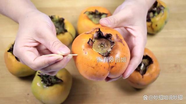 五:牙签催熟法。 我们都知道,柿子就算放在桌面,时间一长,它也是会变软变甜的,只不过这个过程比较慢,可能要一个多星期,期间还容易出现腐烂。那么想要快速催熟柿子,我们也可以利用它本身产生的催熟气体。只需要拿根牙签,然后用牙签在柿子表面均匀的扎上一些小孔,可以多扎上一些。扎的这些小孔就能有助于加速柿子内催熟的乙烯释放。