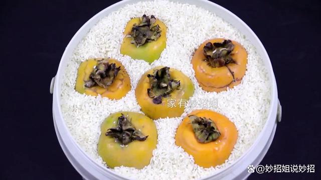 三:大米催熟法。 家里的大米也是可以用来催熟柿子的,方法很简单,我们先将柿子表面的一些灰尘杂质之类的擦拭干净,然后直接把柿子埋进大米中就可以了。由于大米透气保暖,同时里面又含有一种乙烯气体,这种乙烯气体可以帮助催熟柿子。并且大米非常干燥,柿子表面有多余的水分,也可以被大米吸收掉,这样就可以防止柿子腐坏变质。大概放置上三天左右,柿子的涩味就被去除了,变得香甜软糯的。