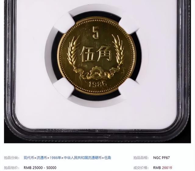 其中最稀少的年份是1986年,它仅仅只发行了660枚,自然这种年份的5角就变得异常的珍贵了,在今年的7月就有一枚币面略带氧化点的86年5角拍出了26619,足足是涨了50000多倍,如果品相要再好一些的话也有拍卖成交的案例。