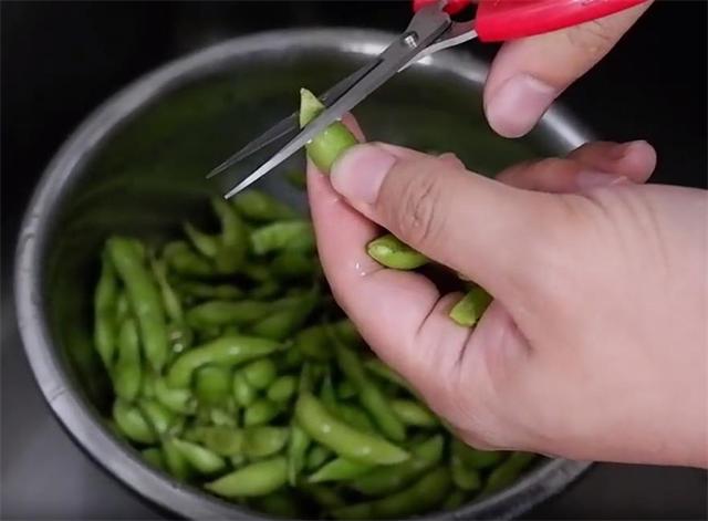 1.又到了吃毛豆的时候,买了一斤做个凉拌毛豆,今天这个做法和正常的煮毛豆不一样,要靠凉拌来增加毛豆的味道。毛豆买回来之后,用水多冲洗几次,搓洗泡20分钟,再把毛豆的两端都剪掉。