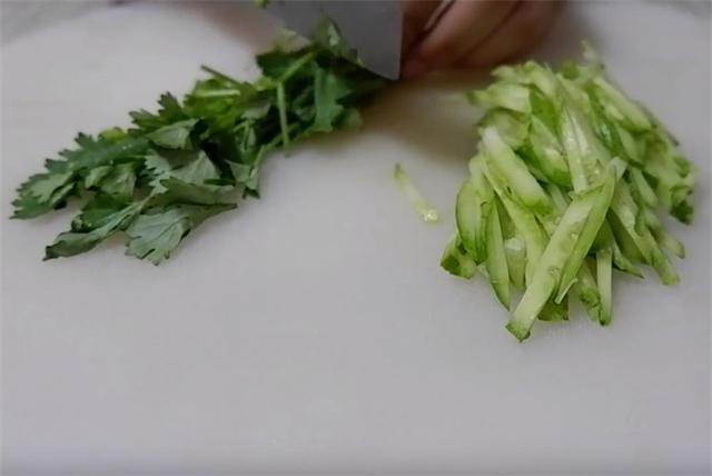 6.再加入黄瓜和香菜,倒入拌料,用手抓匀就可以吃了。