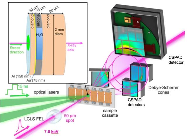 水也是构成冰巨行星(如天王星和海王星)的主要成分之一。这些行星的内部压力和温度非常高,远远超过了地球上水的常见状态。在这样极端的条件下,水会发生什么样的变化呢?一种可能性是水会完全分解为氢原子和氧原子,形成一个金属态的混合物。另一种可能性是水仍然保持分子结构,但形成一种新型的冰相。 为了探索冰巨行星的内部结构和性质,我们需要了解水在极端条件下的相变和电导率。然而,实验上测量这些性质是非常困难的,因为需要产生高达数百GPa的压力和数千K的温度,并且能够对水的结构进行精确的探测。 最近,一组科学家利用美国斯坦福大学的直线加速器相干光源实现了对水在冰巨行星内部条件下的动态压缩实验。他们使用一种叫做飞秒激光震波的技术,将一束强激光照射在水样品上,产生一个高速的冲击波,将水压缩到高压高温状态。同时,他们使用另一束X射线自由电子激光作为探针,对水样品进行X射线衍射分析,从而获得水分子中氧原子的排列方式。