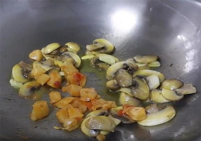 5.再另起锅,先把口菇炒一下,口菇炒变色变软后,加入蒜片,再加入咸菜炒匀。