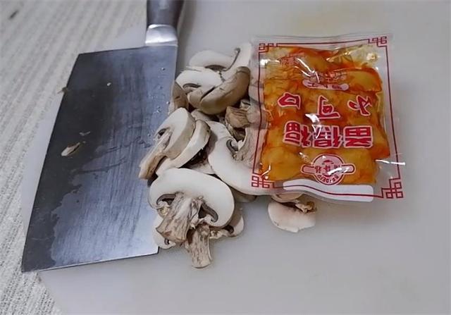 3.然后再把几个口菇切片,准备一袋小咸菜。
