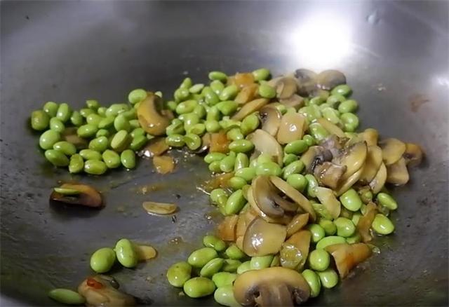 6.然后加入毛豆大火炒匀,加入素蚝油、酱油,炒香之后加少量的水,一直翻炒,最后加入盐,汤炒干就可以出锅了。