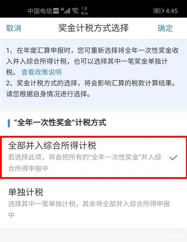 5、点击进入工资薪金下方“奖金计税方式选择”,全年一次性奖金计税方式下有两种可选择“全部并入综合所得计税”和“单独计税”,选择其中一种;