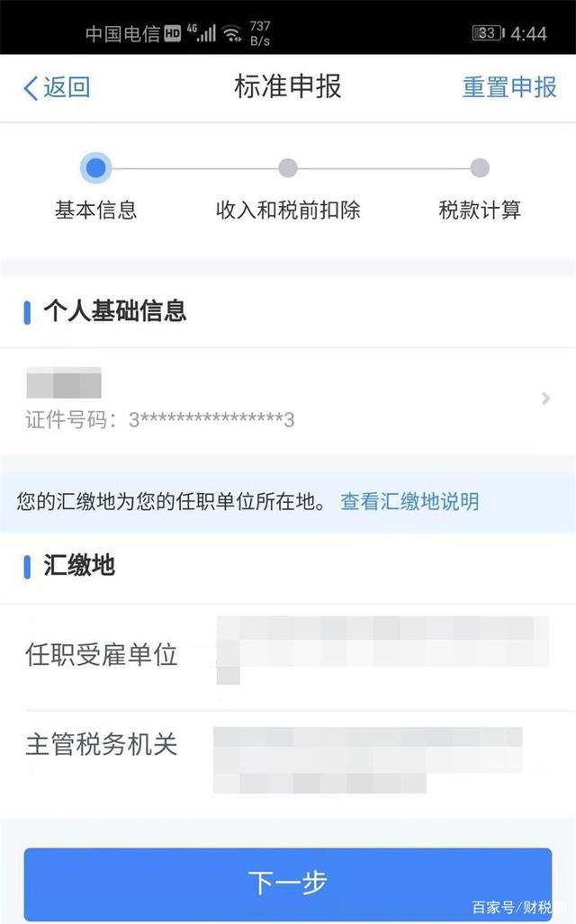 4、进入标准申报页面,注意收入和税前扣除中,核对相关信息,点击进入下一步;