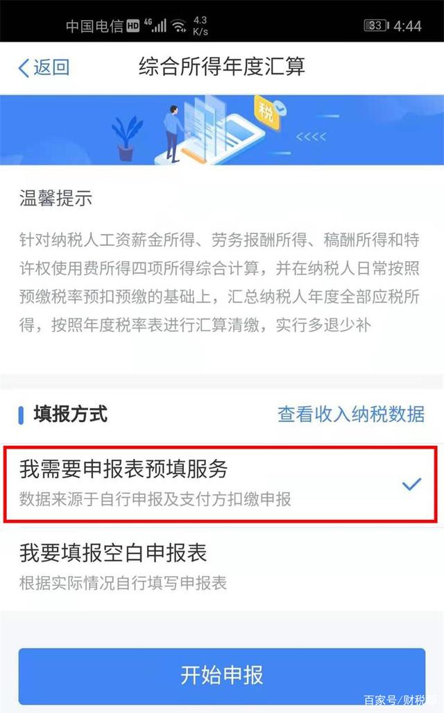 2、进入综合所得汇算申报页面,填报方式有两种,“我需要申报表预填服务”“我要填报空白申报表”,工作单位已经预扣预缴个税的,则选择第一种方式,开始申报;