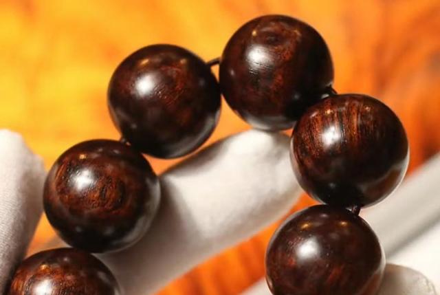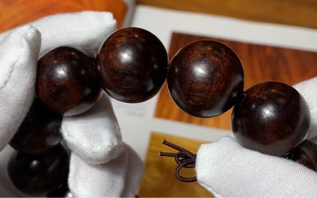 而且是越紫越好越黑越好,所以说这种货在市面上特别受欢迎,比如说图片中这一条,这是一条2.2尺寸12粒的越黄油梨老料的佛珠,它比正常的珠子要大一些,所以说手围看起来很大,料子很老油性密度也不错,市场价格能到2000多点。
