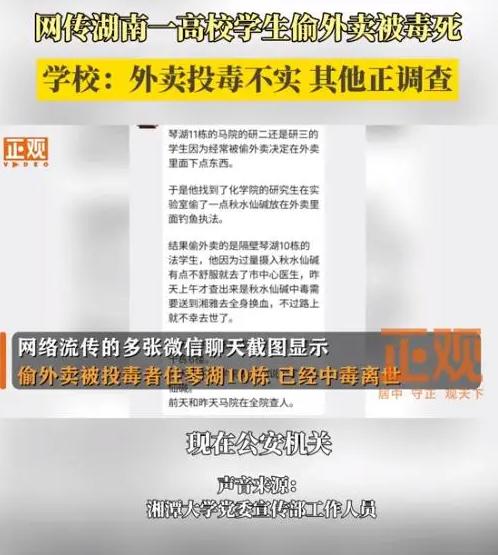 4月19日都在传湘潭大学有学生因为外卖被偷,一气之下竟然在外卖里投了毒,结果导致另一个学生吃了中毒死了。 赶紧上网看了看,据说这事发生在湘潭大学的琴湖公寓,有个学生发现自己的外卖老是被偷,心里那叫一个气!