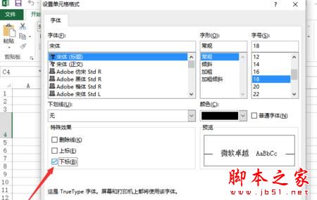 五、在设置单元格格式对话框中,选中特殊效果下的下标,并点击确定按钮。如图所示:
