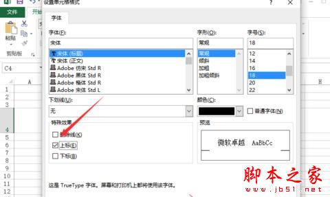 八、在设置单元格格式对话框中,选中特殊效果下的上标,并点击确定按钮。如图所示: