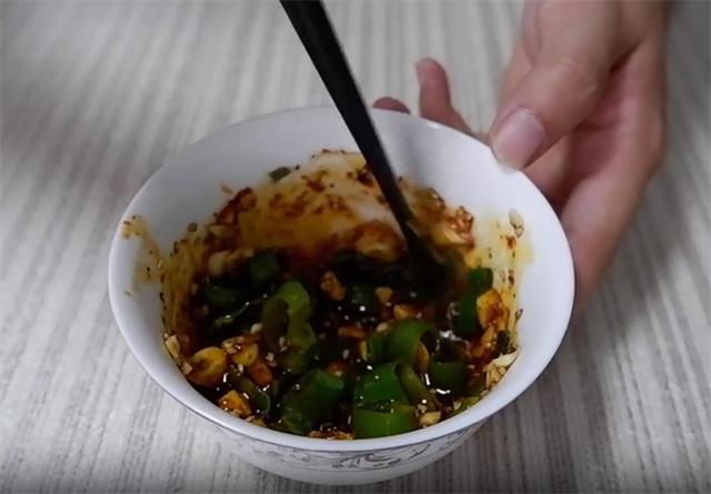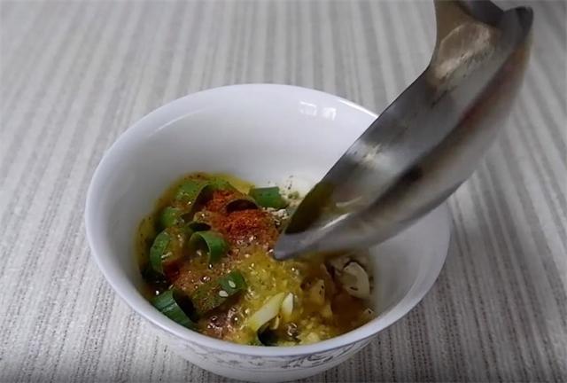 3.这个时候调一下凉拌料,碗中加葱花、蒜末、白芝麻、辣椒粉,浇上热油炸香。