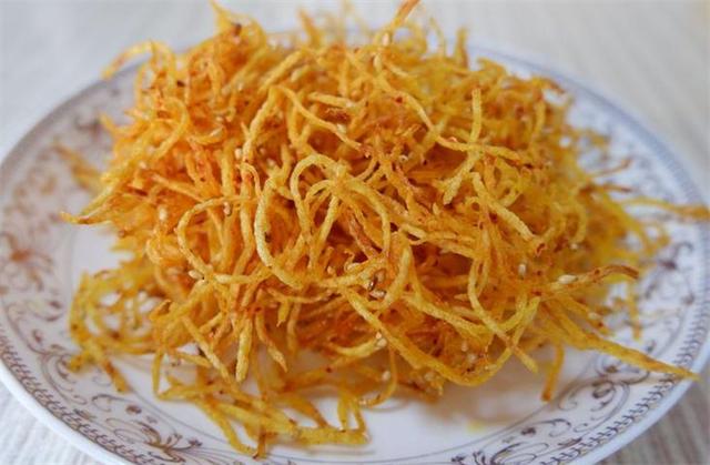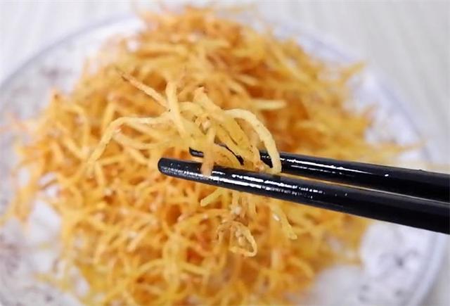 4.土豆丝变酥,颜色金黄就可以盛出了。