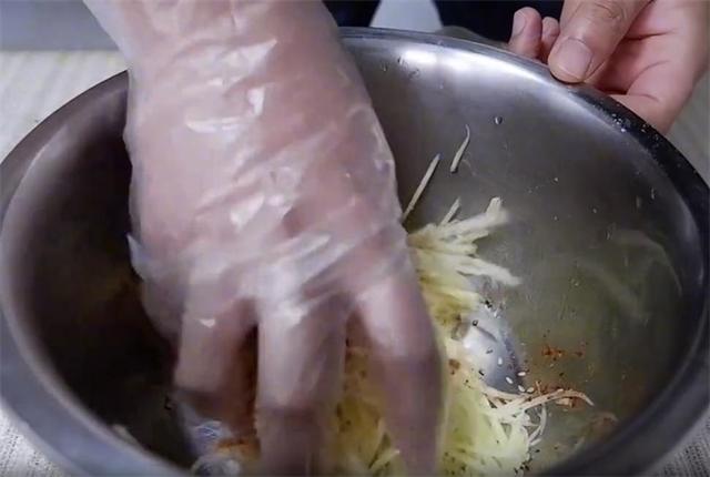 3.锅中加油,七成热加入土豆丝,中火慢炸,把土豆丝的水分榨干。