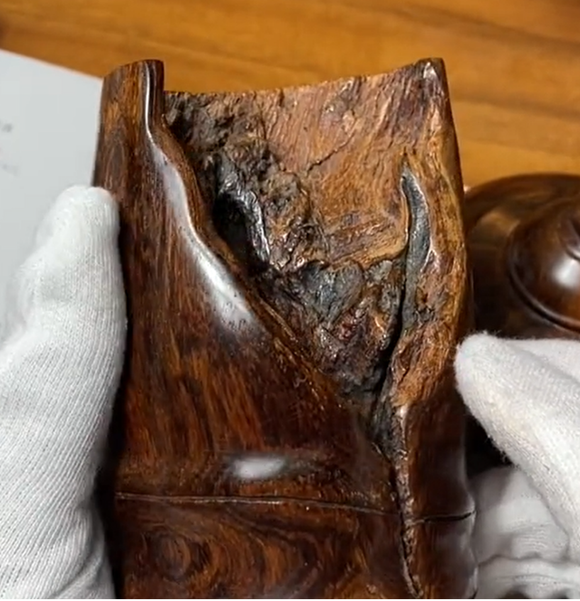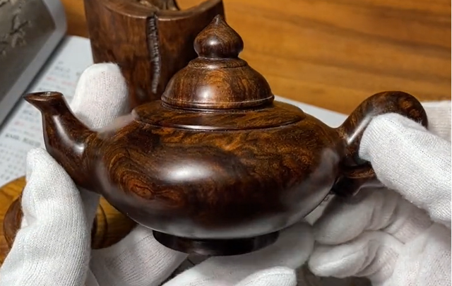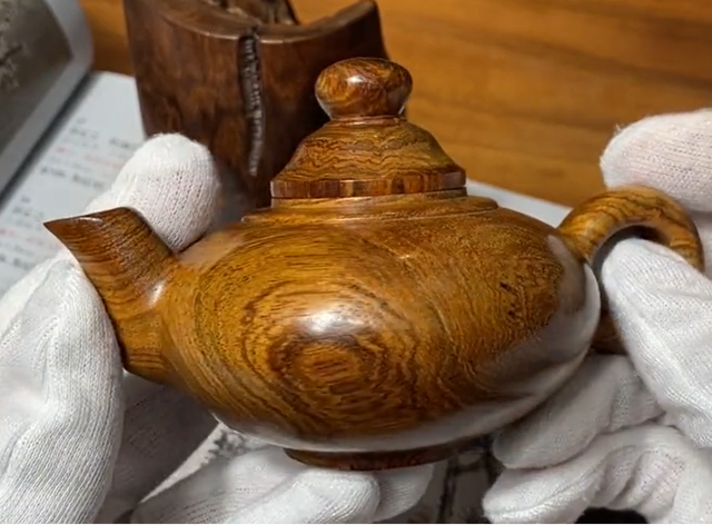 咱们再看看成品,像越南黄花梨的老料的小壶,花纹非常漂亮的市场价格就要到2000多了,像北部湾的油梨的老料,市场价格就要到三四千了,再看一块风化皮沙料的,带一点水波纹理带一点小瘤疤,克价也要在10左右。