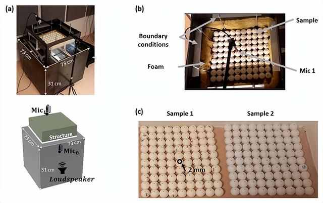 在本文中,我们要介绍的是一种基于亥姆霍兹共振器的声学超材料表面。亥姆霍兹共振器是一种简单而古老的装置,它由一个空腔和一个开口组成。当空气通过开口进入或出去时,空腔内部会产生一个压力变化,从而导致空气振动。如果入射的声波频率与空腔内部振动频率相匹配,那么就会发生共振现象,即空腔内部振动幅度增大,并且消耗入射声波的能量。这样就实现了对特定频率声波的吸收。 Helmholtz共振器可以用来制造各种形状和大小的声学超材料表面。发表在《应用物理学杂志》(Journal of Applied Physics)的一篇论文中,作者使用了一个非常便宜且容易获取的材料——乒乓球,来制作了一个亥姆霍兹共振器。他们在每个乒乓球上钻了一个小孔,并将它们排列成一个二维数组。每个乒乓球都可以看作一个亥姆霍兹共振器,其空腔就是球内部,其开口就是小孔。这样,整个数组就构成了一个声学超材料表面。