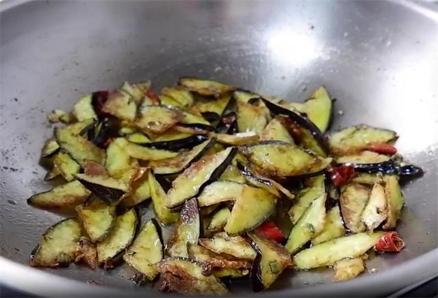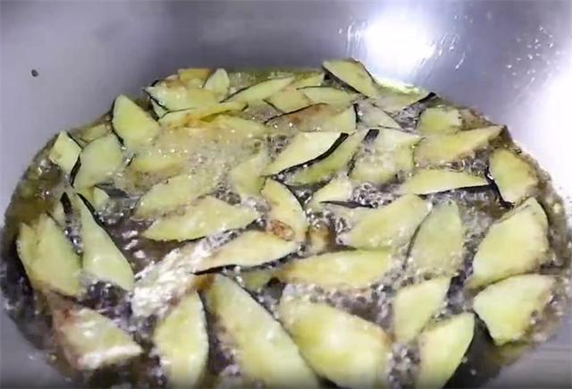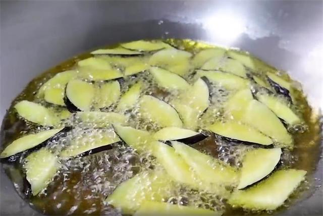 3.接着把茄子炸一下,七成油温下油锅,中火慢慢炸,等茄子开始沙沙响的时候捞出。