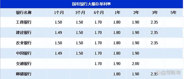 工商银行:20万起存,1个月1.50%,3个月1.50%,6个月1.70%,1年期1.80%,2年期1.90%,3年期2.35%。 建设银行:20万起存,1个月1.49%,3个月1.50%,6个月1.70%,1年期1.80%,2年期1.90%,3年期2.35%。 农业银行:20万起存,1个月1.50%,3个月1.50%,6个月1.70%,1年期1.80%,2年期1.90%,3年期2.35%。 中国银行:20万起存,1个月1.49%,3个月1.50%,6个月1.70%,1年期1.80%,2年期1.90%。 交通银行:20万起存,3个月1.70%,6个月1.90%,1年期2.00%。 邮政银行:20万起存,1年期1.80%,2年期1.90%,3年期2.35%。 从利率上看,各家国有银行的同期大额存单的利率相差都不大,仅交通银行1年期和2年期的利率比其他国有银行高一些。 2、股份制银行。 股份制银行有12家,下面是部分股份制银行的最新利率情况。