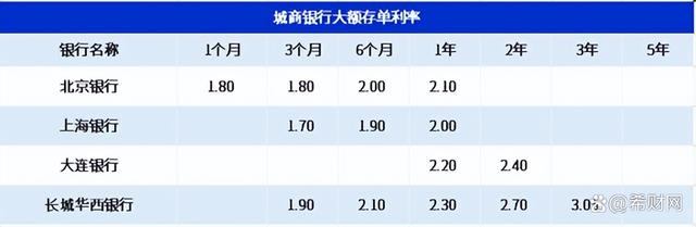 北京银行:20万起存,1个月1.80%,3个月1.80%,6个月2.0%,1年期2.10%。 上海银行:20万起存,3个月1.70%,6个月1.90%,1年期2.00%。 大连银行:20万起存,1年期2.20%,2年期2.40%。 长城华西银行:20万起存,,3个月1.90%,6个月2.10%,1年期2.30%,2年期2.70%,3年期3.05%。 城商银行的大额存单利率比股份制银行又要高一些,且各银行之间的利率也不太相同。 4、农商银行 农商银行的数量多达上千家,不同银行的大额存单利率也可能不同,下方为部分农商银行的最新大额存单利率。