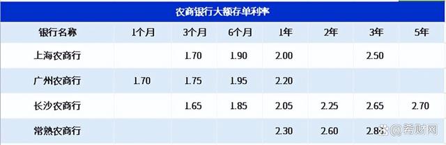 上海农商行:20万起存,3个月1.70%,6个月1.90%,1年期2.00%、18个月期2.10%、3年期2.50%。 广州农商行:20万起存,1个月1.70%,3个月1.75%,6个月1.95%,9个月2.00%,1年期2.20%。 长沙农商行:20万元起存,3个月1.65%,6个月1.85%,一年期2.05%,二年期2.25%,三年期2.65%,五年期2.70%。 常熟农商行:20万元起存,1年期2.30%,2年期2.60%,3年期2.8%。