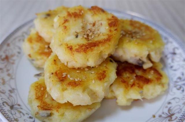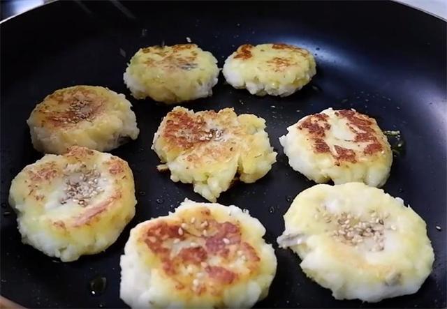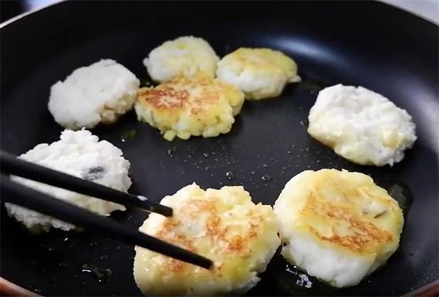 5.接着用平底锅加少量的油,把山药苹果泥分成均匀的每一份,放入平底锅开始煎,一直小火,一面煎金黄之后翻面。