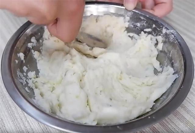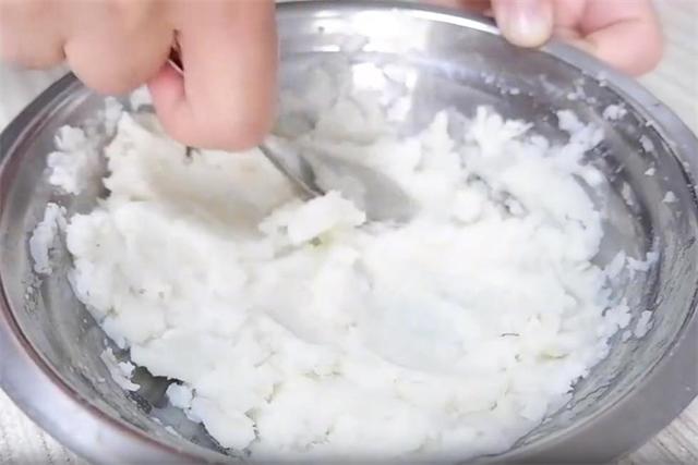 4.再把苹果碎放入山药泥中,再加入3勺淀粉,完全的搅匀,这里一定要搅拌的均匀,压的细腻一些。