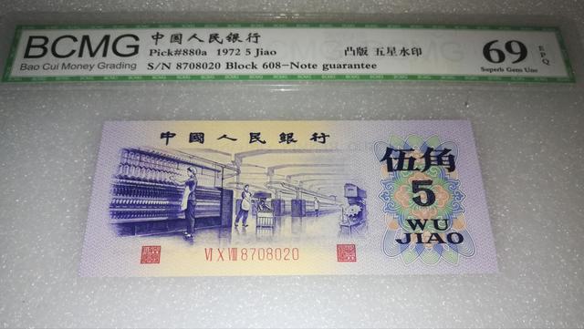 其中关门冠156最少,市价也最高,目前普通的72年五角纸币整包的在50万左右,单张也就是在50,凸板有水印的单张在100左右,它的水印对着光就可以看到是满版的五角星水印,如果你遇到了72年五角纸币,一定要留意它的版别。 |
