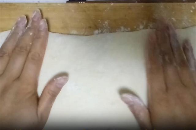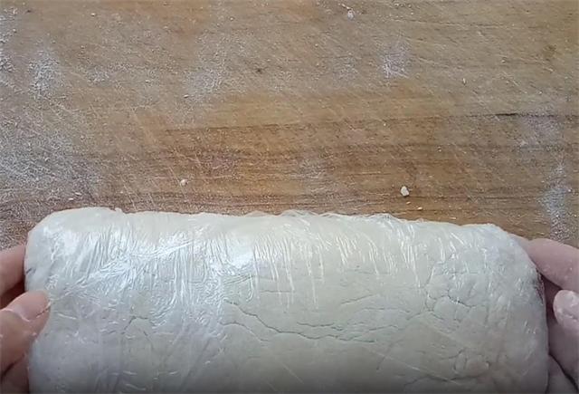 2.面板上撒上少许的面粉,把揉好的面团放到面板上做成长方形的形状,然后用保鲜膜包好,包好以后放到冰箱冷藏一晚,这一步的目的是让面团自然发酵,口感松软,早起后把面团拿出来拍着有砰砰的响声就说明面团已经发酵好了。