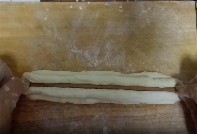 5.然后把切好的细条像这样按压在一起之后,用筷子在中间按一下。