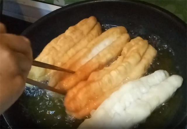 6.所有油条做好之后,下面我们就开始炸制,锅中下油,油一定在滚开之后才开始下油条,这样炸出的油条外酥里嫩,大家放油条的时候一定要注意,油不要碰到手,大约炸两分钟左右的时候,看底面已经金黄的时候,这时候翻过来炸至另一面。