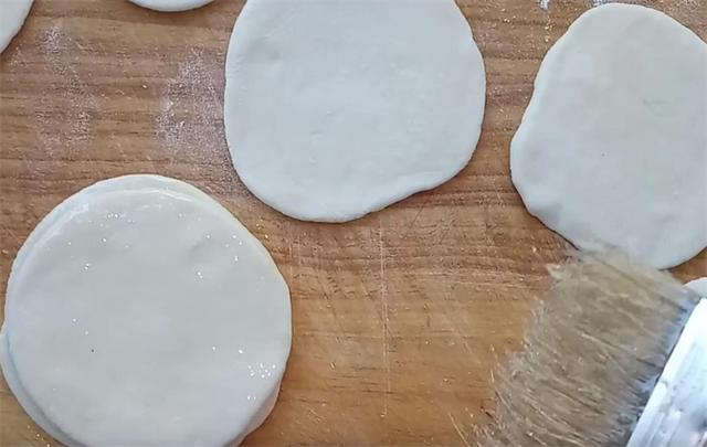 4.把面饼均匀的刷油,然后五六个面饼摞在一起,刷油一定要均匀,要不然擀的时候容易粘连在一起。